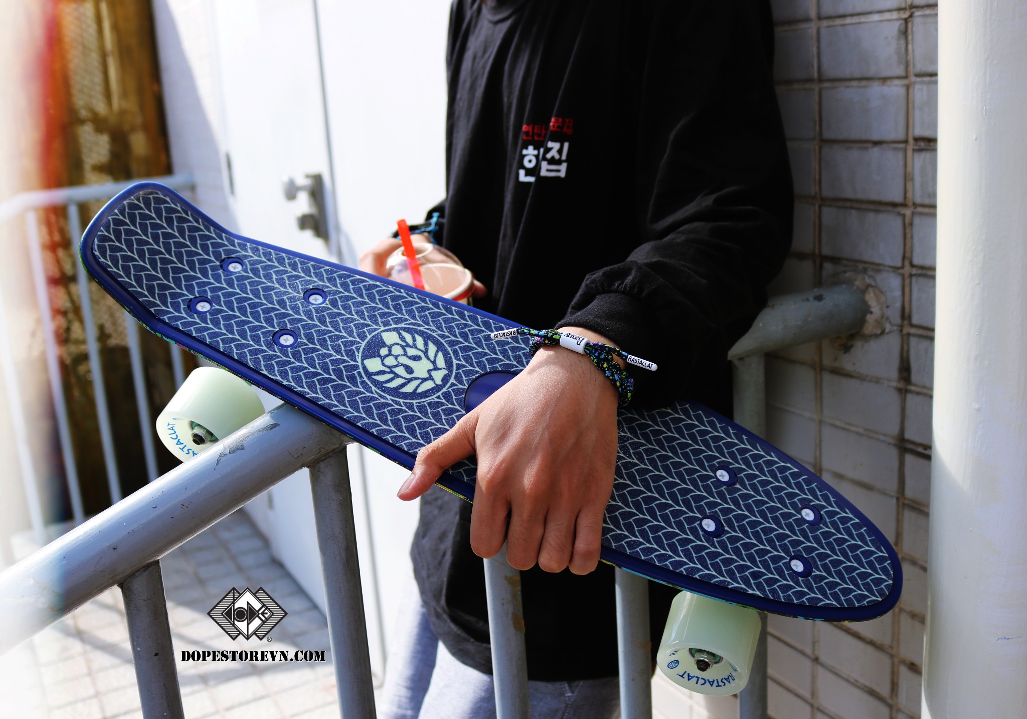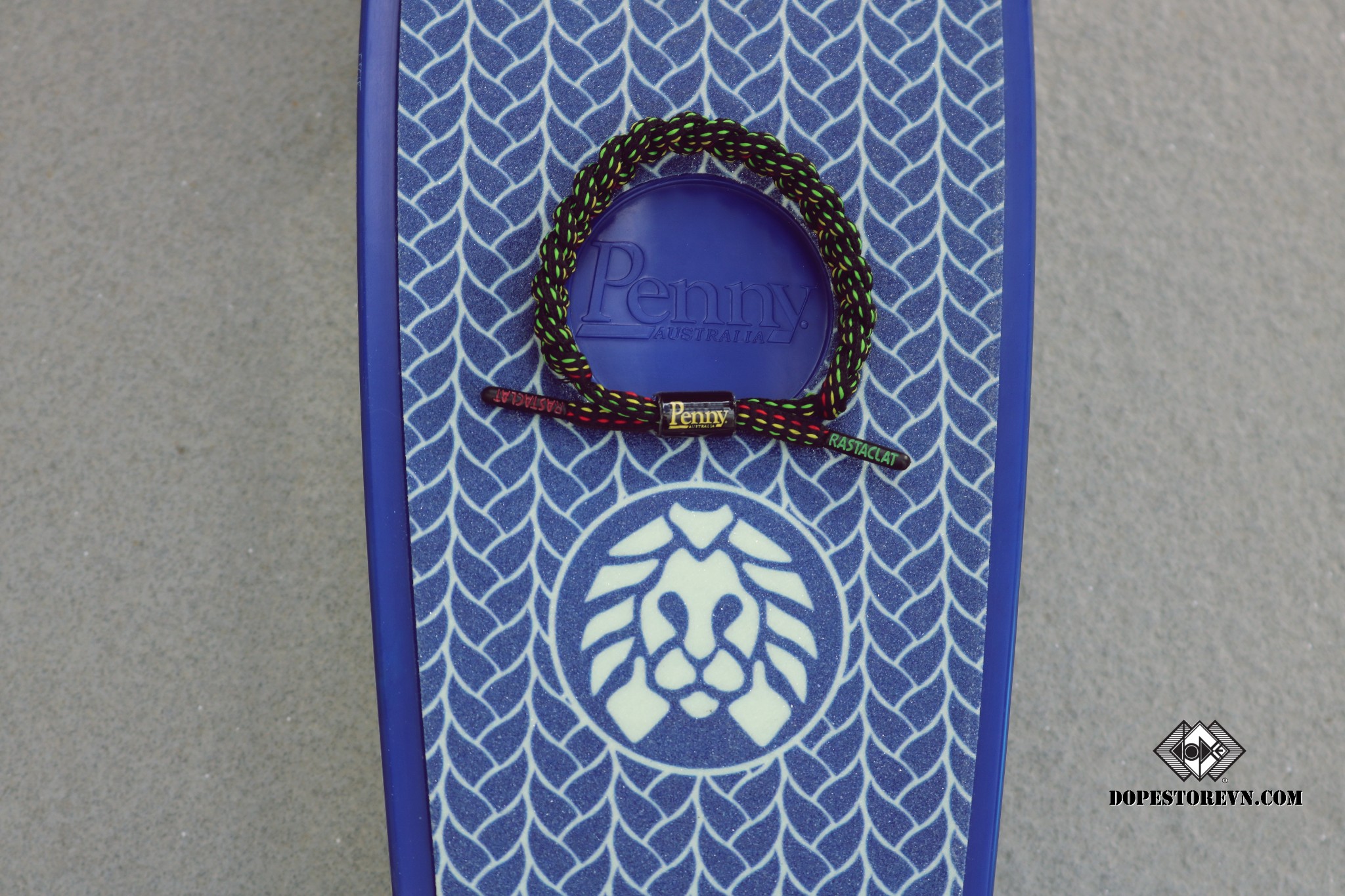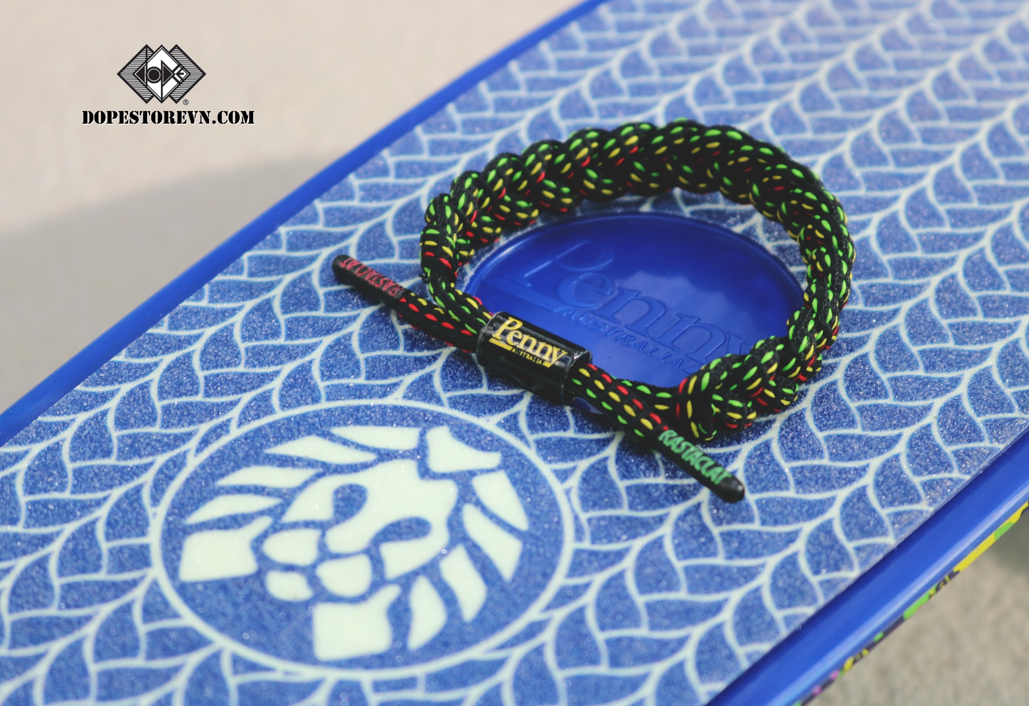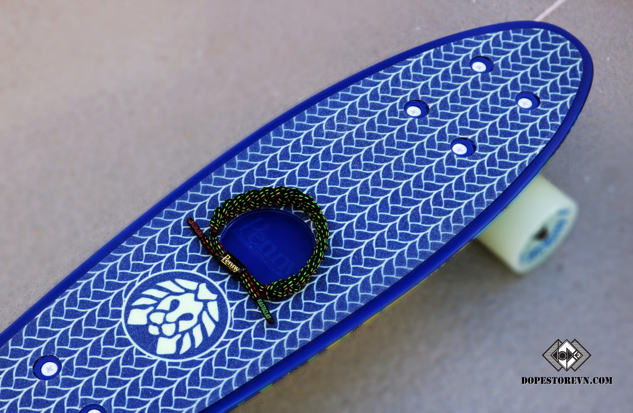 Ván trượt Penny có màu chủ đạo là màu xanh dương nhám. Nếu để ý kỹ tinh tế một chút thì các bạn sẽ thấy hoạ tiết phần trên ván trượt chính là hình ảnh những chiếc dây Rastaclat được đan xan kẽ nhau và đính kèm logo Rastaclat ngay giữa.